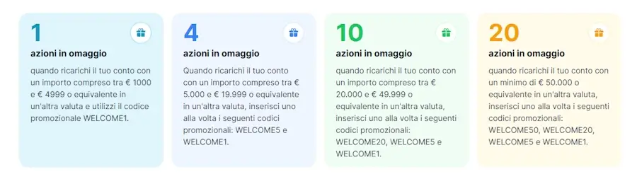 - Deposito pari o superiore a 50.000€: 20 azioni in regalo. Codici da inserire: WELCOME50, WELCOME20, WELCOME5 e WELCOME1