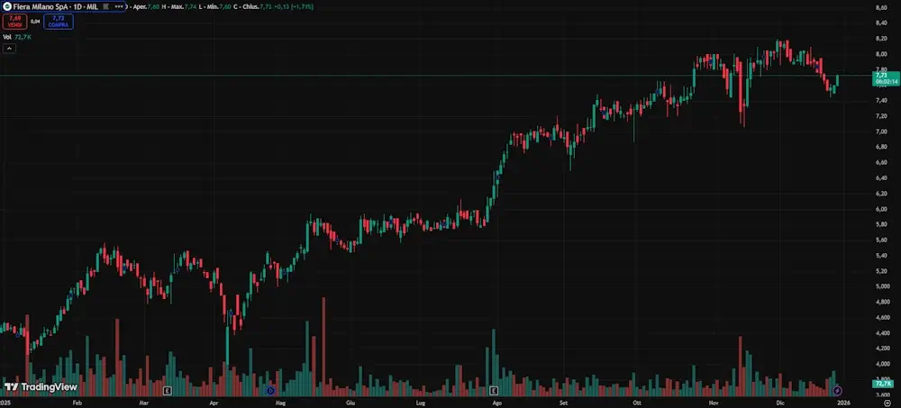 Il titolo ha registrato un forte rialzo nel 2025. Nel momento in cui scriviamo, la capitalizzazione di mercato è di circa 545 milioni di euro, il prezzo delle azioni si attesta intorno a 7,58€, con una crescita del 32,75% negli ultimi sei mesi e quasi del 70% su base annua. Questo aumento riflette l’interesse degli investitori per il modello di business che va oltre le fiere tradizionali.