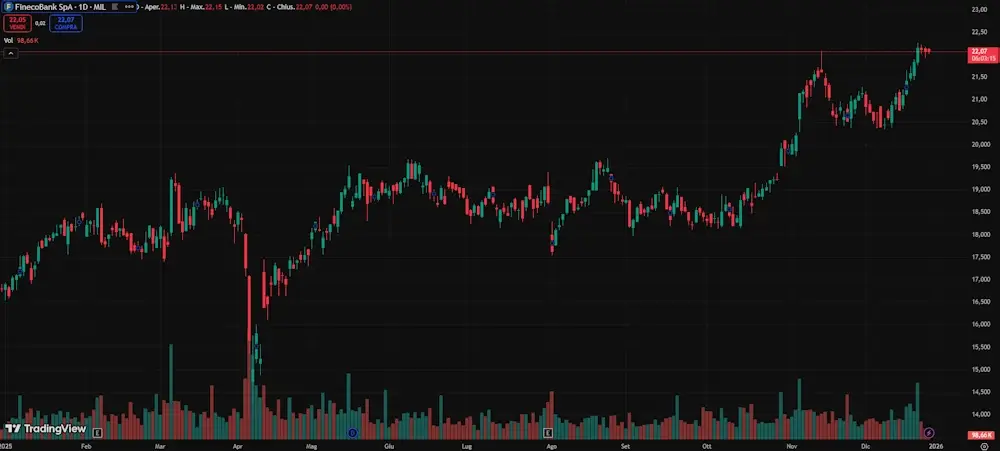 Al 23 dicembre 2025, il titolo presenta una capitalizzazione di mercato superiore ai 13 miliardi di euro, mentre il prezzo delle azioni si colloca intorno ai 22€. Dall’inizio dell’anno, la crescita è stata significativa, con un rialzo superiore al 32%, che ha portato il titolo a superare i massimi registrati nel 2024.
