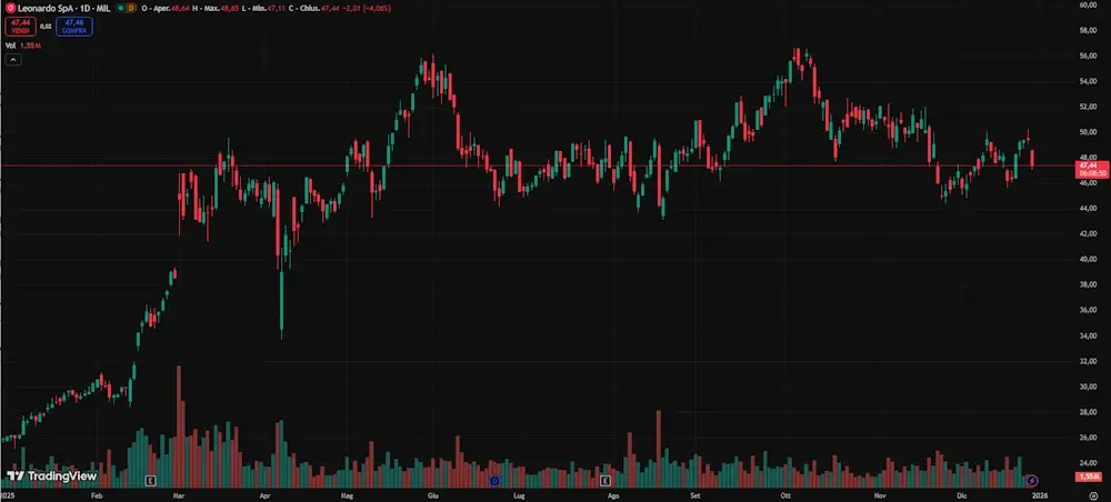 Alla fine del 2025, il titolo presenta una capitalizzazione di mercato superiore ai 28 miliardi di euro, collocandosi tra le principali società industriali quotate sul FTSE MIB. Il prezzo dell’azione si attesta intorno ai 50€, dopo un significativo rialzo registrato nel corso degli ultimi dodici mesi. La performance a un anno è pari a circa +93%, un dato che riflette sia il miglioramento dei fondamentali operativi sia il rinnovato interesse del mercato per il comparto difesa.