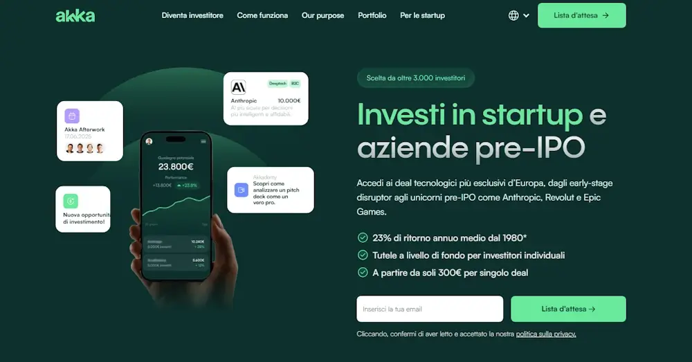 Akka permette di investire in aziende private prima della quotazione, spesso in fase early o growth e vicine a una possibile IPO, come nel caso di Revolut, Epic Games e Anthropic.