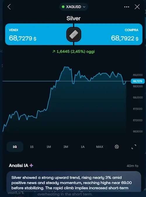 - CFD sull'argento: se scegli il Conto Trading CFD, puoi aprire posizioni sull'argento tramite CFD. Questo strumento è utile per speculare sui movimenti di prezzo a breve termine, sfruttando la leva finanziaria per amplificare i risultati (e i rischi).