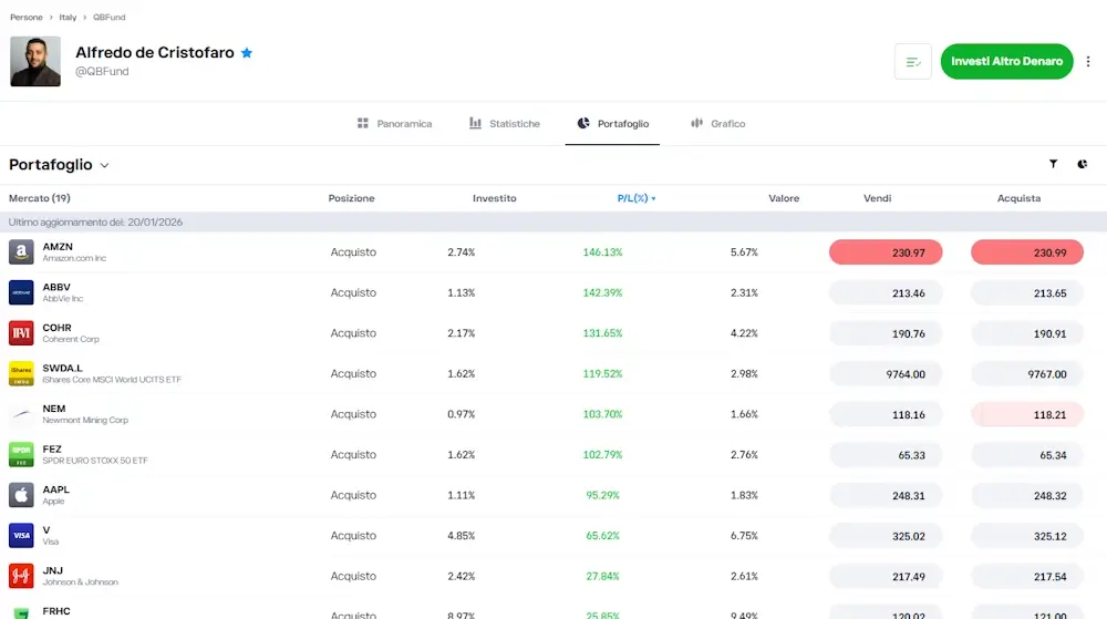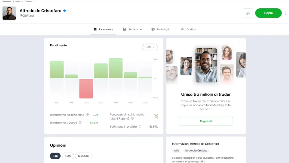Ecco un esempio di profilo di un Popular Investor (in questo caso l'autore della recensione):