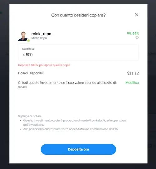 Una volta scelto il Popular Investor da copiare: