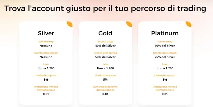 - Conto Gold: pensato per trader intermedi. Garantisce una riduzione del 50% sullo spread rispetto al Silver e uno sconto del 40% sui tassi overnight, abbassando sensibilmente i costi per chi mantiene posizioni aperte.