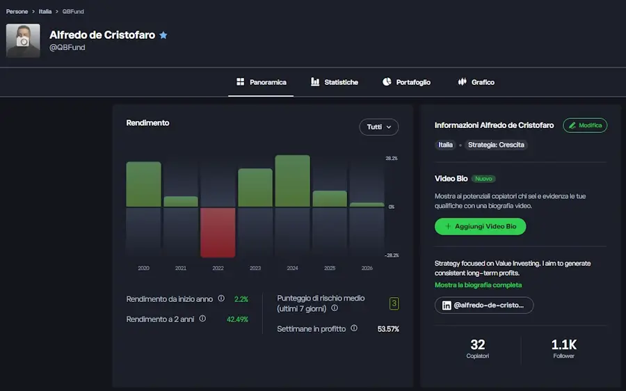 Ogni trader ha un profilo pubblico con: