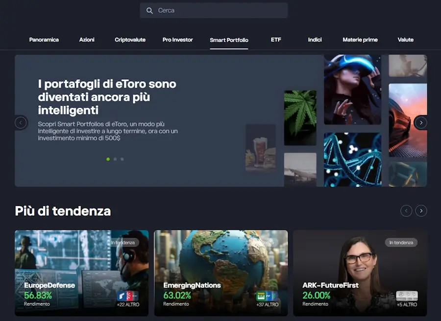 Se la funzione "Copia i Pro Investor" permette di replicare il portafoglio di un singolo trader, con Portafogli intelligenti (o Smart Portfolios) puoi replicare un gruppo di trader (Top Trader Portfolio) selezionati dal comitato di investimento di eToro oppure un paniere di asset sottostanti (Market Portfolio).