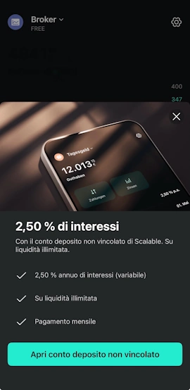 *Interesse p.a. lordo variabile su liquidità illimitata. Condizioni e distribuzione della liquidità su scalable.capital/conto-deposito-non-vincolato