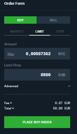We select the order type among Market, Limit and Stop, then we enter the amount and, in case of limit or stop order, we set any limit/stop price. At this point we insert the order by clicking on the PLACE BUY ORDER button (or PLACE SELL ORDER in case of sale).